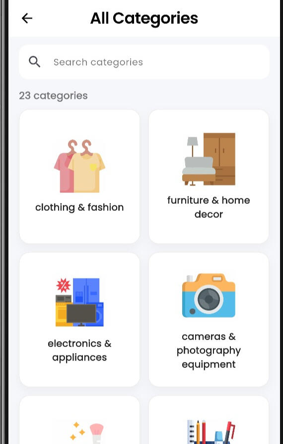 Browse products across clearly organized categories to find items from different local stores more easily.